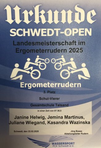 Zwei „Boote“ unserer Schule starteten im Februar bei den „Offenen Landesmeisterschaften im Ergometer-Rudern“ in der Sporthalle „Neue Zeit“. Die beiden sog. Schulvierer bestanden aus je vier Mädchen und Jungen der Sekundarstufe II.