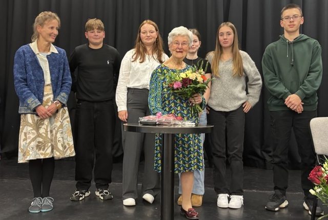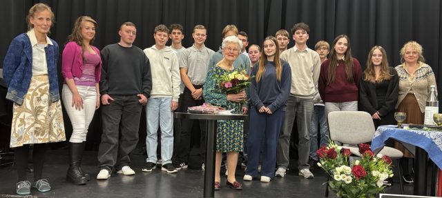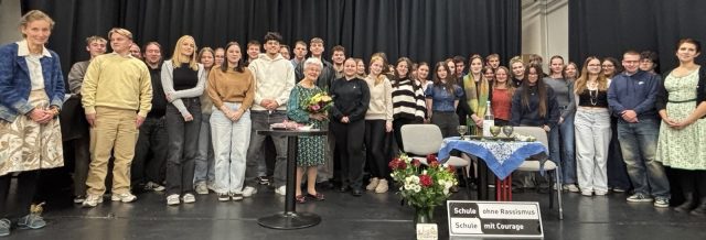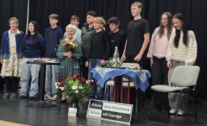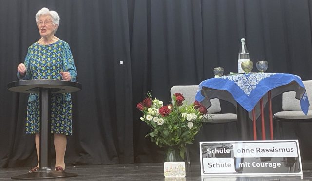 Nach den Grußworten teile Frau Leignel eindrucksvoll und ergreifend mit dem Auditorium, ihre Erinnerungen, ihre persönlichen Erfahrungen und Schrecken mit dem Holocaust, eine alles in allem sehr bewegende Geschichte, in der die Unbeschwertheit der Jugend auf die unaussprechliche Grausamkeit der Menschen trifft, wobei aber auch die unglaubliche Widerstandsfähigkeit der Jugend deutlich wird. Frau Leignel betonte mehrfach die Bedeutung von Resilienz und Menschlichkeit und forderte die Schüler und Schülerinnen auf, ihr zu schreiben und ihre Botschafter zu werden, um das Vergessen zu verhindern, sich aktiv für Demokratie, Vielfalt und gegen Extremismus einzusetzen, um so für alle Menschen – ohne Rücksicht auf Herkunft oder Religion – eine Zukunft in Frieden und ohne Rassismus zu gestalten.