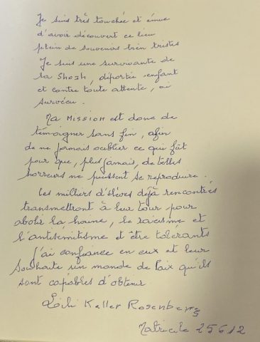 Am 15. September 1932 in Croix (Nordfrankreich) in eine jüdische Familie ungarischer Abstammung geboren, wurde Lili Keller-Rosenberg im Alter von nur 11 Jahren, am 27. Oktober 1943, zusammen mit ihrer Familie verhaftet und in das Sammellager Mechelen in Belgien transportiert. Während ihr Vater nach Buchenwald deportiert wurde, erlebte sie mit ihrer Mutter und ihren Brüdern die Deportation nach Ravensbrück und später nach Bergen-Belsen, wo sie am 15. April 1945 befreit wurde.