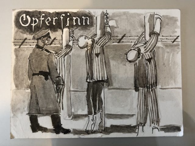 Unsere Gruppe hatte das Privileg, uns vor der eigentlichen Buchpräsentation mehr als zwei Stunden in einem persönlichen Ateliergespräch mit dem Künstler auszutauschen. LUZ – Zeichner, Künstler, Autor – skizierte uns in einem sehr intimen Gespräch, den Prozess der Entstehung seines Buches, angefangen von ersten Ideen, die erweitert, verworfen und dann durch Geistesblitze sich in die endgültige Form verwandelten. Nach einem Jahr intensiver Arbeit vollendete er sein Buch, zu einem Zeitpunkt, der zufälligerweise mit dem Ergebnis der Wahl zum Europaparlament zusammenfiel. Dass die Ergebnisse dieser Wahl ihn dermaßen erschrecken würden, hatte er zu Beginn seiner Arbeit nicht ahnen können. Die Notwendigkeit des Erinnerns durch Künstler an die nachfolgenden Generationen wurde durch das Wahlergebnis augenfällig. Die häufig nach dem Ende des Zweiten Weltkriegs und dem damit verbundenen Niedergang des Nationalsozialismus angeführte Behauptung, man hätte nichts von den Gräueltaten gewusst, ist in der heutigen, digital vernetzten Welt durch die allgegenwärtige Verfügbarkeit von Informationen nicht mehr tragbar. Da rechtsextreme Bestrebungen in der heutigen Zeit – nicht nur in Deutschland und in Frankreich –, offensichtlich sind, sind Beiträge wie dieses Buch von extremer Wichtigkeit, um Erinnerungen und Mahnung zugleich weiter zu tragen.
