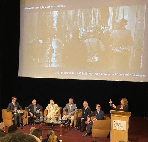 Am 15. Dezember 2025 waren wir, die DELF-AG und die AG Schule mit Courage der Gesamtschule Talsand, in die Französische Botschaft in Berlin eingeladen, um einem besonderen Zeitzeugenbericht beizuwohnen. Vertreter des „Collectif Saint-Jean“ schilderten die Geschichte der Razzien, die sich zwischen dem 22. und 24. Januar 1943 in den alten Vierteln in Marseille ereigneten. Schüler und Schülerinnen Berliner und Brandenburger Schulen waren geladen. Die Razzia vom 21. Januar 1943 im alten Hafengebiet Saint-Jean in Marseille wurde von überlebenden Zeitzeugen eindringlich dargestellt. Es ging darum, an ein fast in Vergessenheit geratenes Verbrechen gegen die Menschlichkeit zu erinnern. Der Abend bildete den Abschluss einer Veranstaltungsreihe, deren Angebote die Gesamtschule Talsand dieses Jahr vollumfänglich genutzt hat. Im Rahmen der Erinnerungsarbeit rund um 80 Jahre der Befreiung waren vielfältige Veranstaltungen im Jahr 2025 durchgeführt worden.